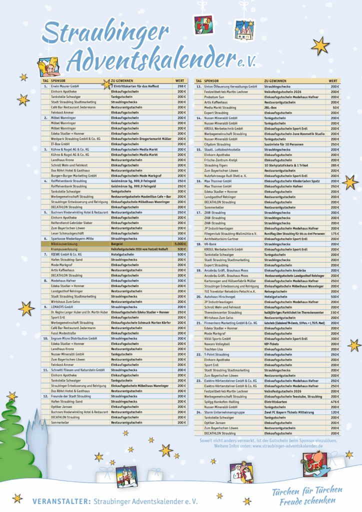 Jeder, der für 1 Euro einen Teilnahmeschein am Losstand oder im Leserservice des Straubinger Tagblatts erwirbt und ausgefüllt am Losstand auf dem Stadtplatz abgibt, nimmt an der gewünschten Tagesverlosung und an der Gesamtverlosung am 23. Dezember 2025 teil. Der Rechtsweg ist ausgeschlossen! Die Warengutscheine können nicht in bar ausgezahlt werden.